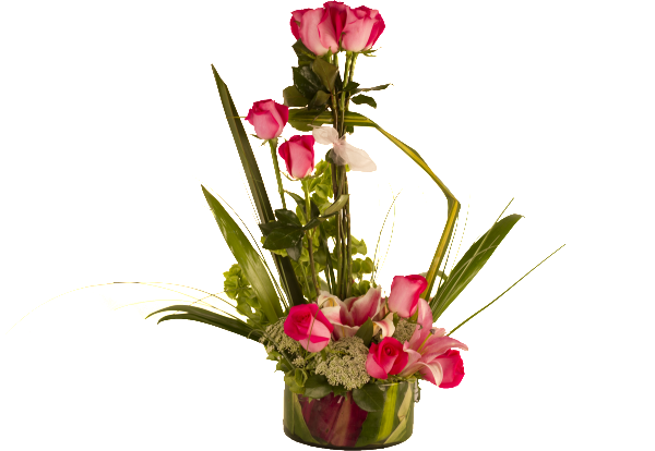Diseño floral de rosas de diferentes colores a escoger y otras flores en base de cristal.
