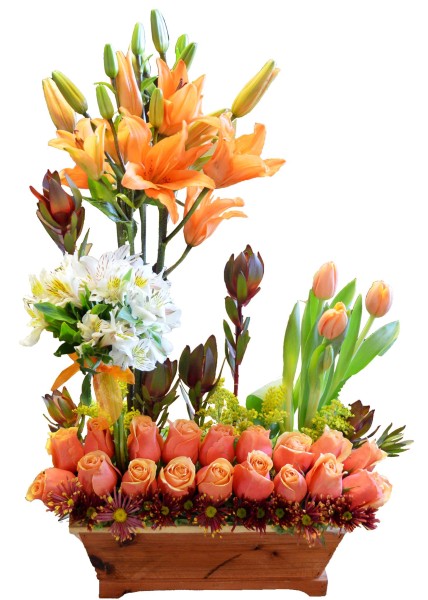 Rosas, tulipanes y lilis en una caja de madera, un toque rustico para un arreglo como este.