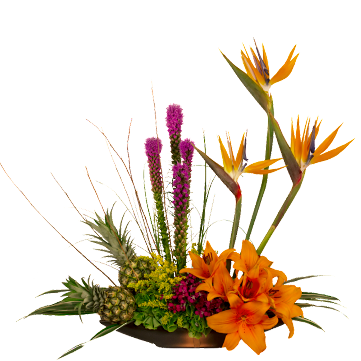 Variedad de flores tropicales en base de barro. Follajes y rellenos pueden variar.