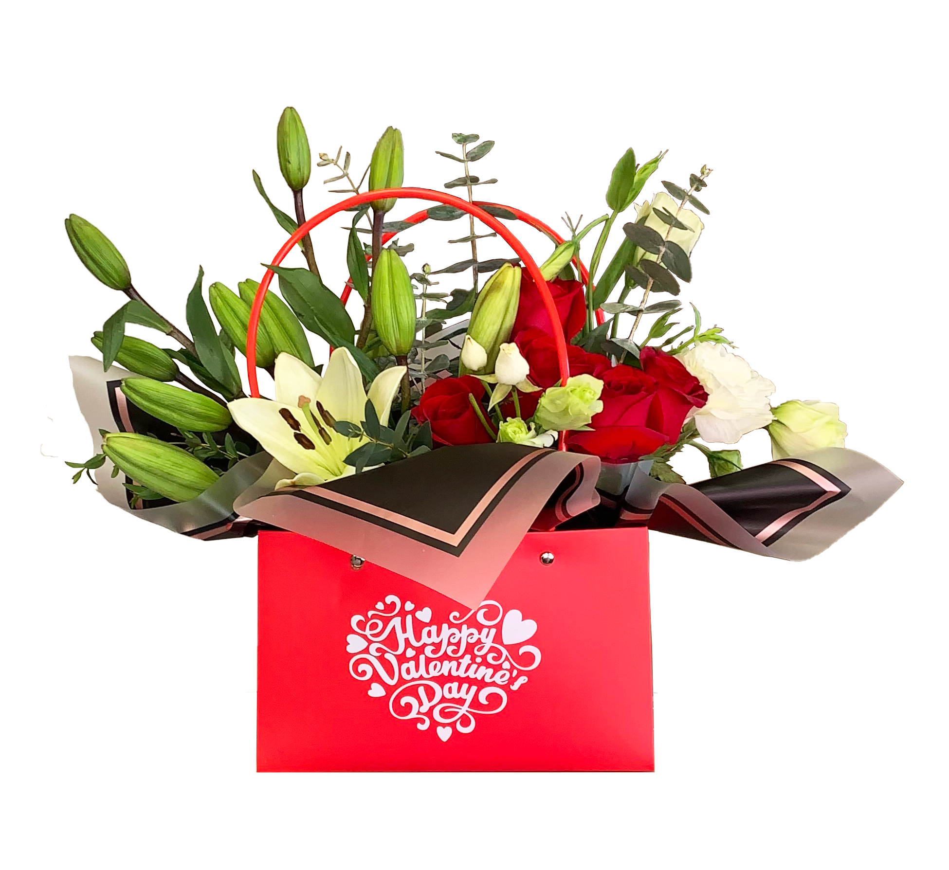 Bolsita rectangular de rosas y lilis, un detalle lindo y sencillo. Follaje y relleno pueden variar. El color de bolsa puede variar según la disponibilidad.