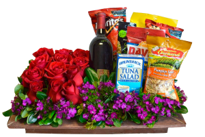 Rosas, vino y botana, el arreglo ideal para compartir y/o regalar en una velada especial.