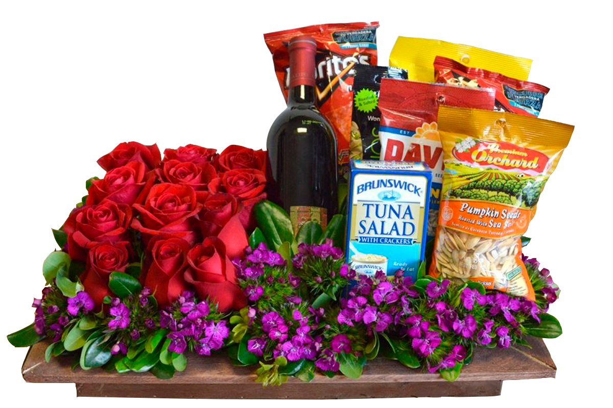 Rosas, vino y botana, el arreglo ideal para compartir y/o regalar en una velada especial.