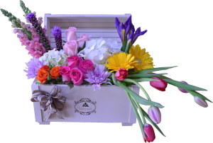 ‘Cofre primaveral’ esta compuesto por distintas flores primaverales, dándole un toque alegre y único.