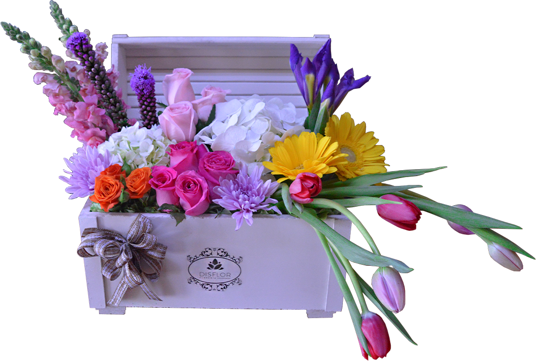 ‘Cofre primaveral’ esta compuesto por distintas flores primaverales, dándole un toque alegre y único.