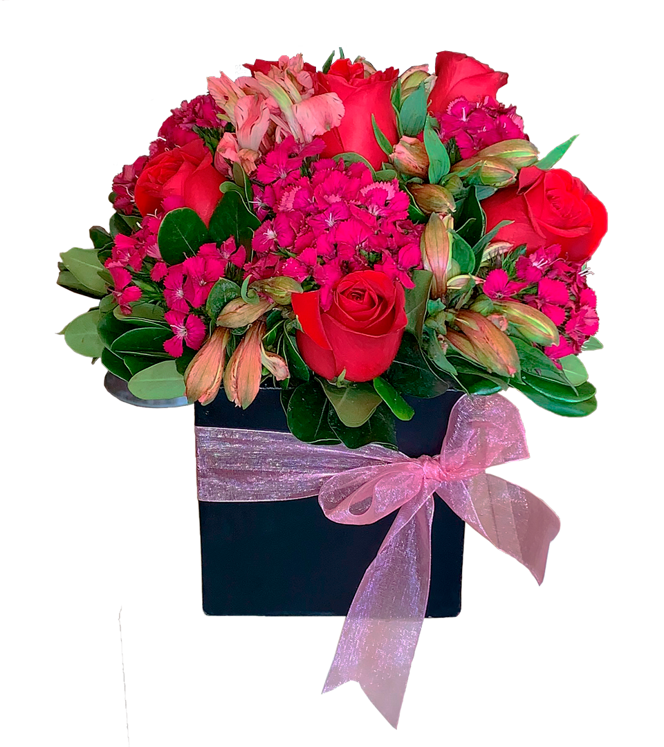 Cubo de 6 rosas rojas. Follaje y relleno pueden variar. El color de la base y del listón puede variar según la disponibilidad.
