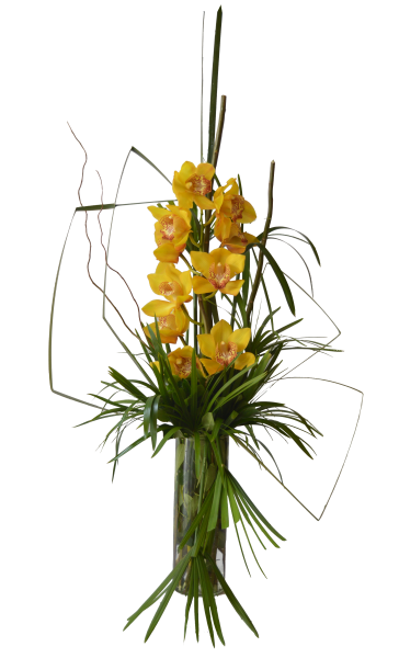 Esbelto florero de cristal con 2 varas de orquídeas. Sencillo y elegante. Follajes y rellenos pueden variar.