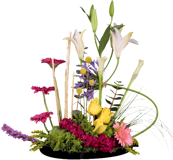 Conjunto de lirios y otras hermosas flores en armonía estilizada, que dan vida a este perfecto diseño. Follajes y rellenos pueden variar.