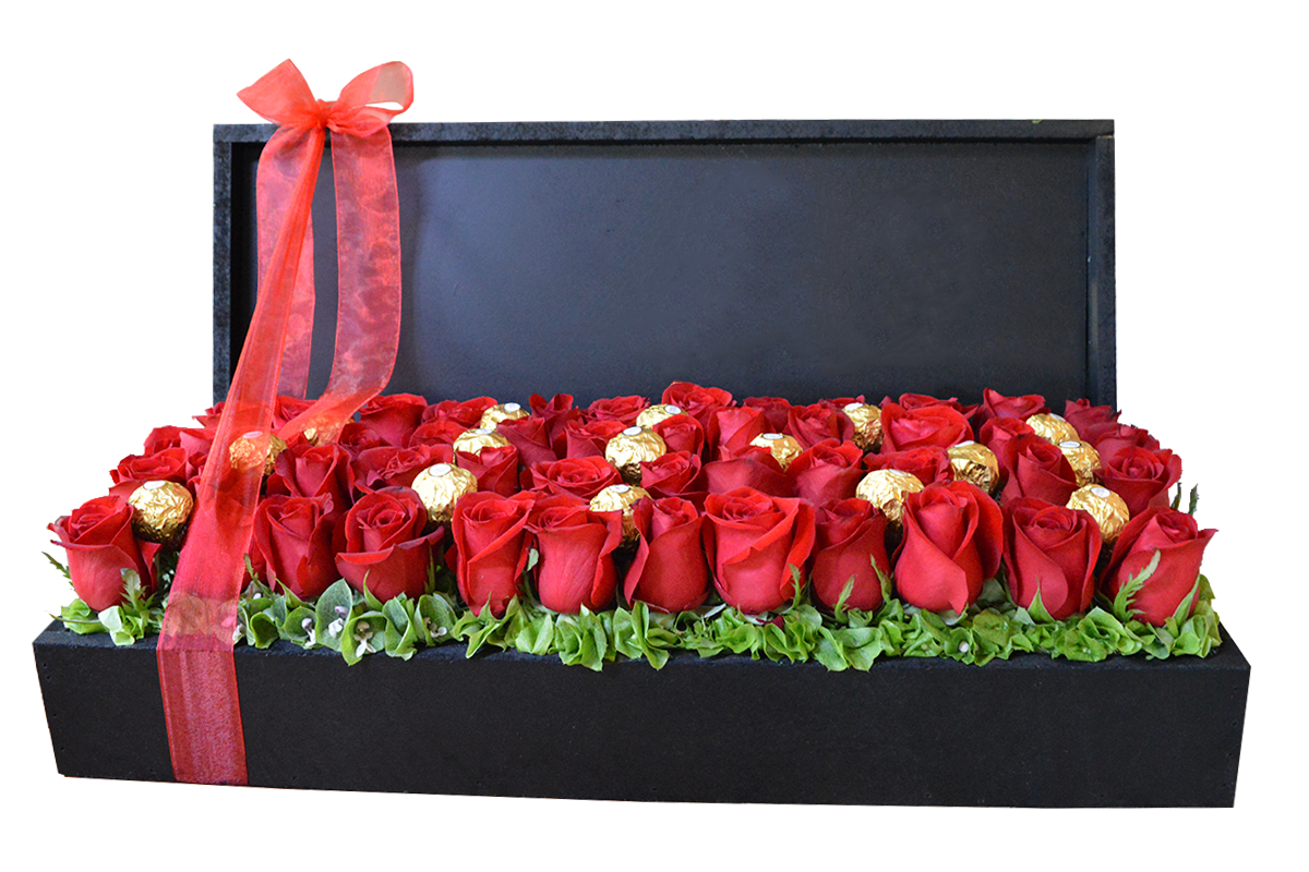 Increíble caja de madera rectangular con tapadera con rosas rojas y chocolates.