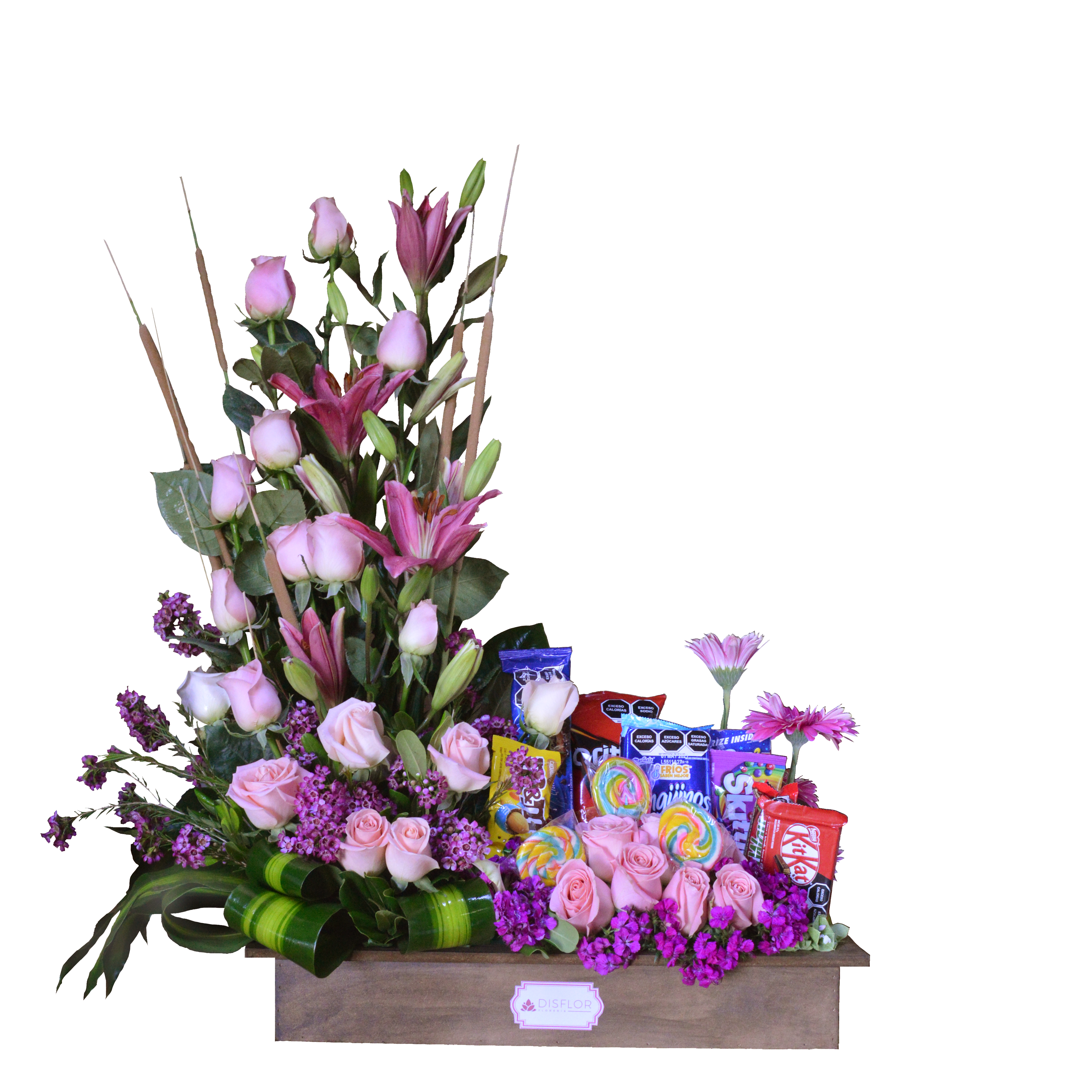 Magnifica dulcera en caja rectangular acompañada de rosas y lilis en color rosado.