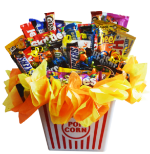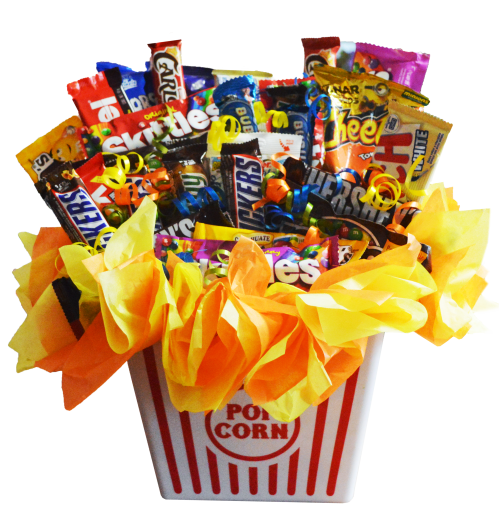 Variedad de dulces y chocolates en base de popcorn. Dulces y color del papel china pueden variar. Sujeto a disponibilidad. Arreglo tamaño único.