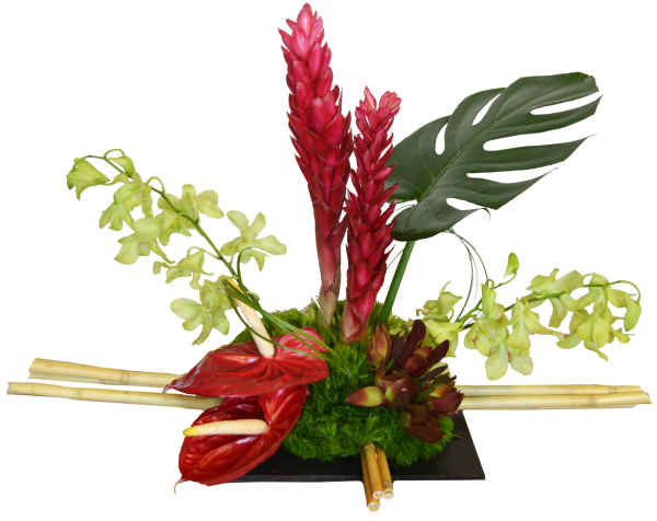 Moderno diseño de anturios, ginger y dendrovios con finos follajes en base de barro o madera. Follajes y rellenos pueden variar.