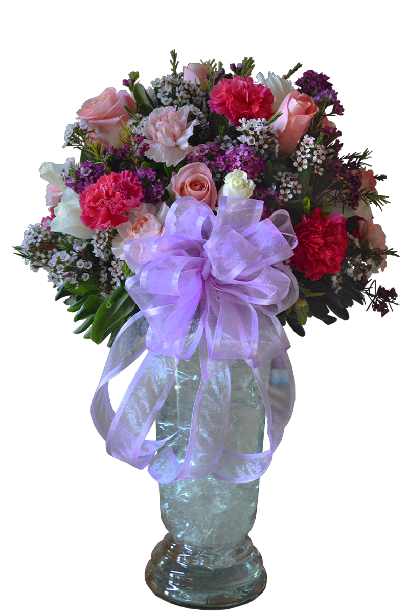 Florero de rosas y claveles ideal para colocar en algún evento especial gracias a su diseño elegante y distinguido.