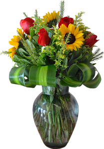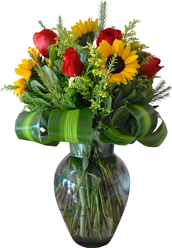 Florero de rosas y girasoles
