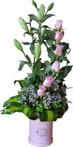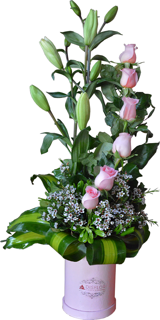 Encantador arreglo en cilindro de media docena de rosas rosas y lilis. Follaje y relleno pueden variar de acuerdo a disponibilidad. Tamaño Chico