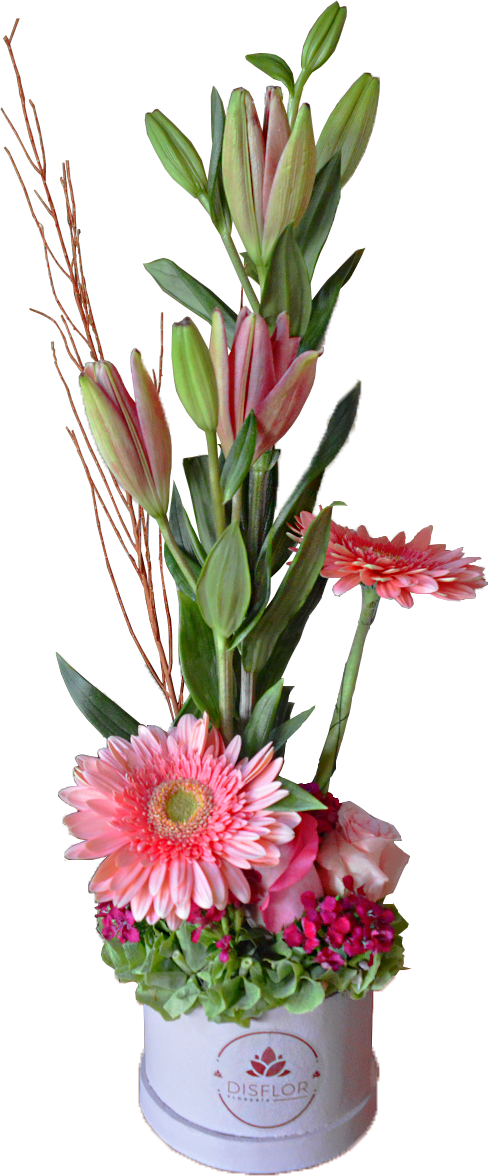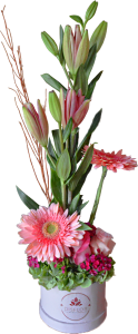 Mini cilindro primaveral con gerberas, rosas y lilis. Follaje y rellenos pueden variar.