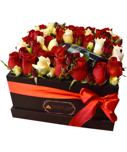 Romántico y elegante arreglo de rosas rojas y blancas acompañadas de un exquisito vino escondido.