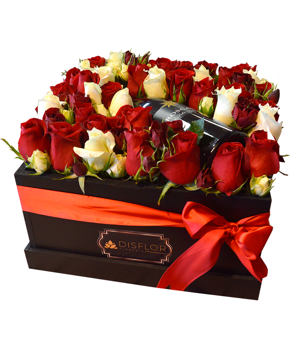 Romántico y elegante arreglo de rosas rojas y blancas acompañadas de un exquisito vino escondido.