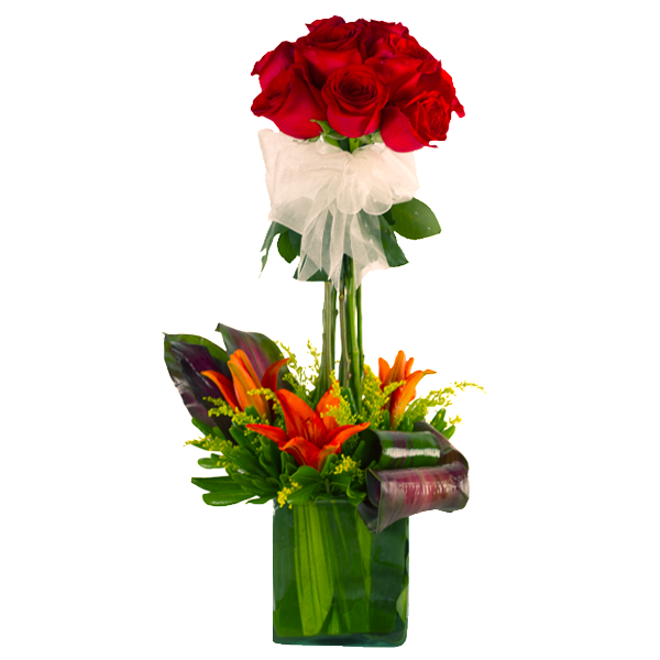 Diseño de rosas estilo topiario decorado con otras flores en base de vidrio, barro o madera.